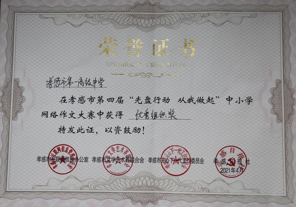孝感市第四届“光盘行动 从我做起”中小学网络作文大赛由孝感市网信办、孝感市关工委、孝感市文联、孝感日报主办。经过网络评选+专家评审等甄选环节,组委会终综合评定出260名同学获奖。其中,其中我校学生获优作奖一等奖7名、二等奖9名、三等奖10名;综合奖一等奖9名,二等奖10名,三等奖10名;人气奖4名。我校有7名教师获优秀辅导老师奖。由于我校参与度高,获奖面大,因而孝感一中荣获优秀组织奖!