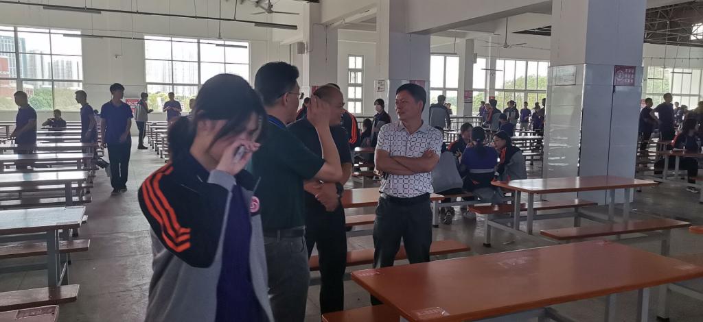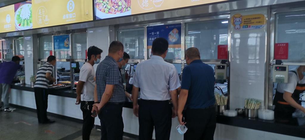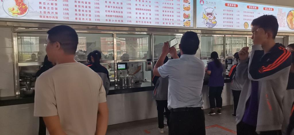 11点20分,来宾一行查看了学生宿舍、食堂就餐情况。他们有的在食堂窗口拍照,有的询同学对就餐的看法,有的向食堂负责人了解情况。