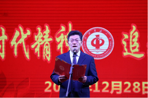 在激越、欢快乐曲声中,付书记上台致元旦贺词,他总结了这一年里学校各方面发展的成果:学校建设更加完善,一中学子取得优异成绩,各项工作圆满完成。付书记深情地展望了学校未来,希望学校在师生的共同努力之下将更上一层楼。