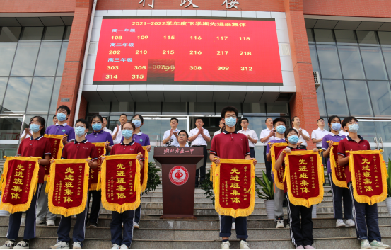 庄严的升旗仪式后校长梅建辉、党委书记付世俊为上学期20位优秀班主任颁奖;副校长张胜华、辛百魁、叶显斌、祝亮分别对210班、118班等12个优秀班集体发放锦旗。