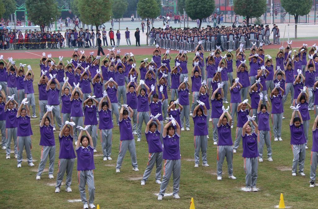 高一年级广播体操刚劲有力,横平竖直的规范也不失跳跃的活泼,是平时日常训练的缩影。