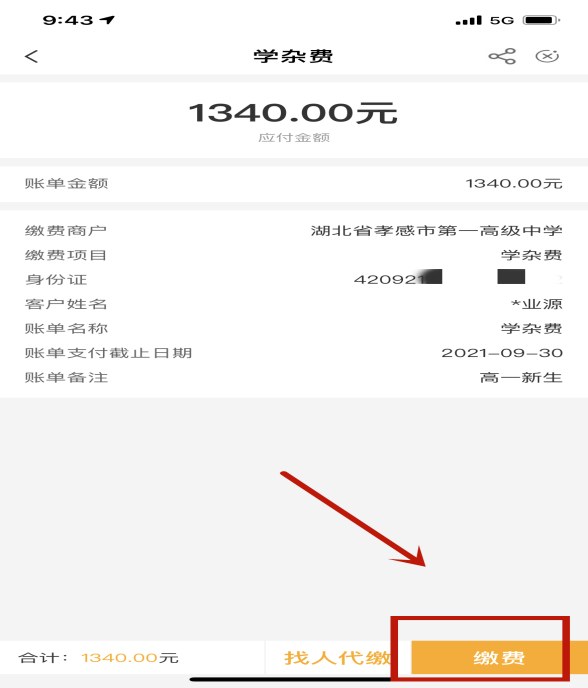 第四步:核对学生信息后,点击“缴费”,输入银行卡密码后,缴费成功