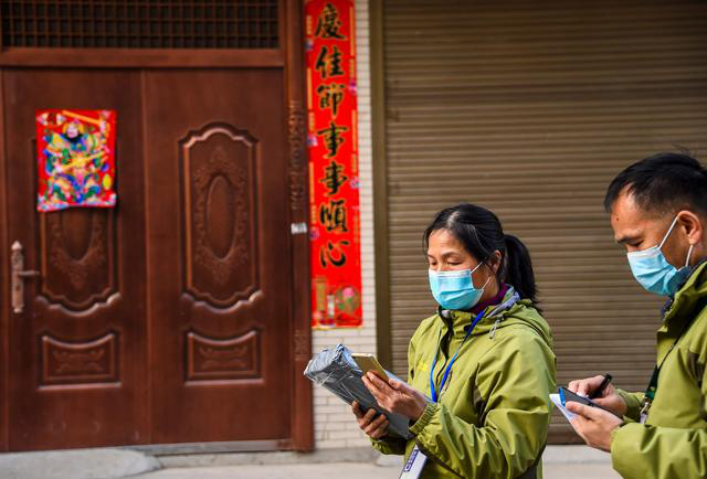 贴快递信息单前,孝感一中的老师逐个核对学生邮寄信息(3月10日摄)。