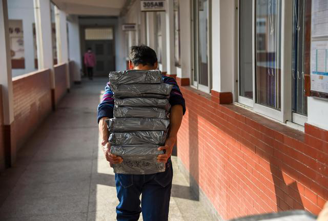 家长沈建群在孝感一中帮忙搬运高三年级学生的学习资料包(3月10日摄)。他说:“特殊时期,为孩子们贡献力量。