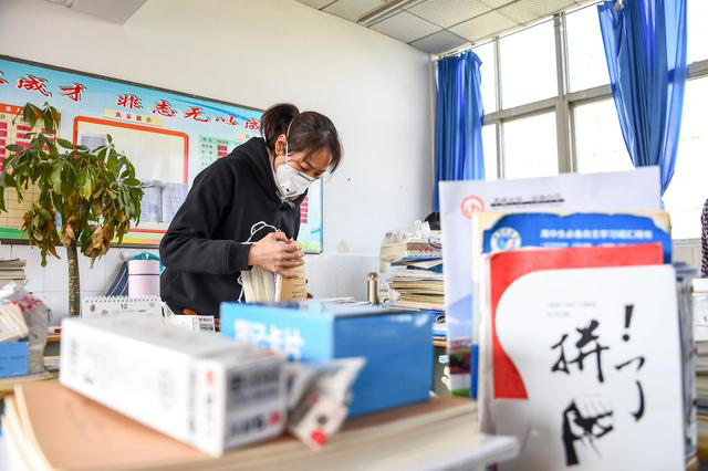孝感一中的老师在教室整理高三年级学生的学习资料(3月10日摄)。