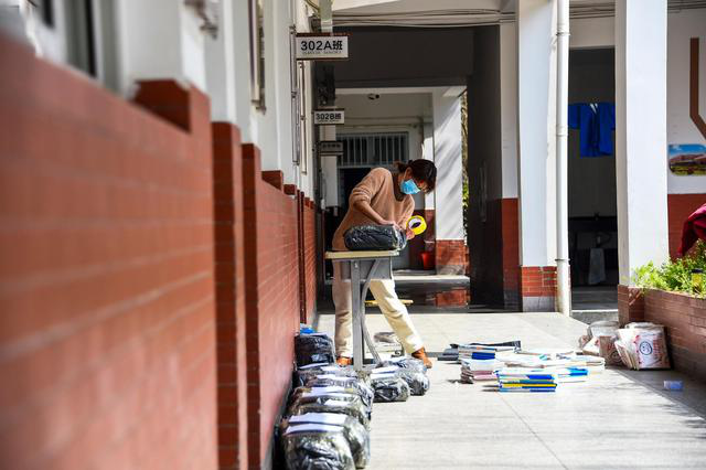 孝感一中老师为高三年级学生打包作业本、笔等文具(3月10日摄)。