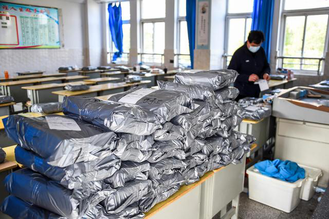 孝感一中的老师在教室核对学生邮寄信息,准备在学习资料包上贴快递信息单(3月10日摄)。受新冠肺炎疫情影响,湖北省孝感市各学校仍处于延期开学状态。为解决学生在家面临缺少必需课本和教辅资料的难题,孝感市教育局联合孝感市邮政分公司、新华书店等为全市中小学生派送学习资料。“助学快递”优先保障高三、初三等毕业班,再依次配送其他年级。记者在孝感一中高三年级组了解到,该校有1000多名高三学生,学校需要逐一核实学生目前所在地的邮寄地址等信息,同时收集学生的学习资料需求并整理成册。目前学校在完成教室消毒的前提下,正组织住校老师和家长等,前往教室整理学习资料。学习资料打包后,交由邮政公司负责免费派送。新华社记者胡虎虎摄影报道
