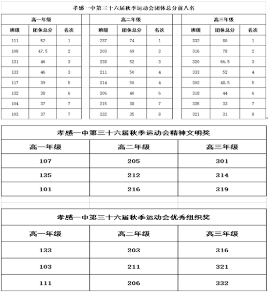 本届秋季运动会历时三天,主要举行了田径项目的比赛,学校工会也组织教师参加了部分比赛项目,经过三天的激烈角逐,各项比赛顺利进行,孝感一中第三十六届秋季运动会完美收官。