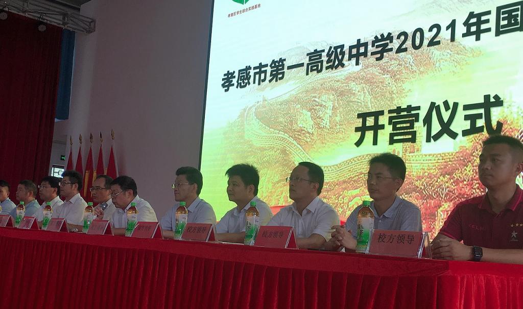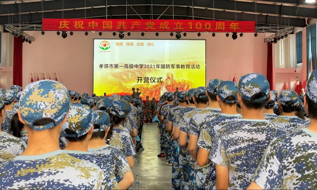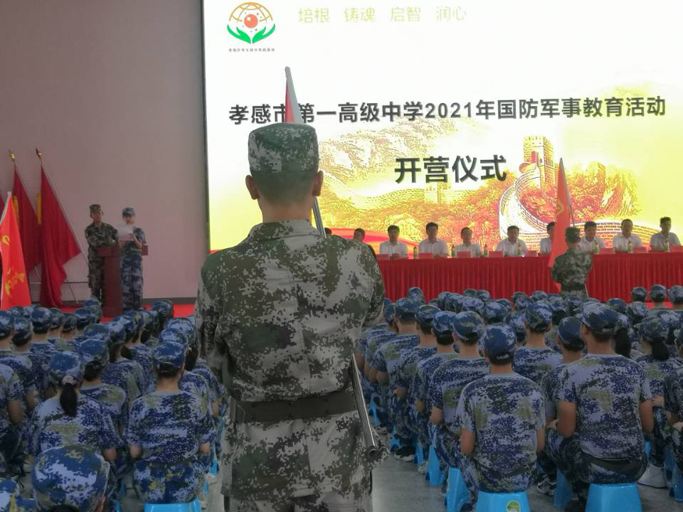 2021年9月24日上午,秋高气爽、阳光灿烂,孝感一中迎来了2021级高一新生国防军事教育实践活动开营仪式。本次开营仪式在孝南区学生综合实践基地培根楼隆重举行!孝南区学生综合实践基地校长刘聪、孝感一中校长梅建辉、党委书记付世俊、副校长张胜华、副校长叶显斌、副校长祝亮、校长助理李平、学生发展中心主任章雄林,高一年级主任侯著宏、钟华志、王力,2021级全体新生、班主任及参训官兵参加了本次开营仪式。