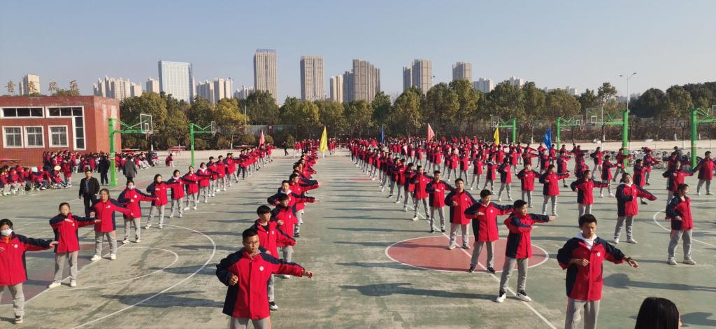 12月5日下午,天空晴朗,阳光灿烂,高二年级18个班级在学校篮球场进了“三操一跳”(广播体操、武术健身操、跑操、跳绳)大比武。学校各年级体育老师担任裁判,高二学生分会干部协助评判,比赛由高二体育老师张宏主持。级部主任付绍斌在比赛开幕时发表了热情洋溢的动员讲话,他希望同学们在比赛中全力以赴,赛出风格与水平,展示班级风采。随后,主持人介绍比赛规则与流程,18个班按要求分坐主席台两侧,各班统一了校服,备好了班牌与跳绳。