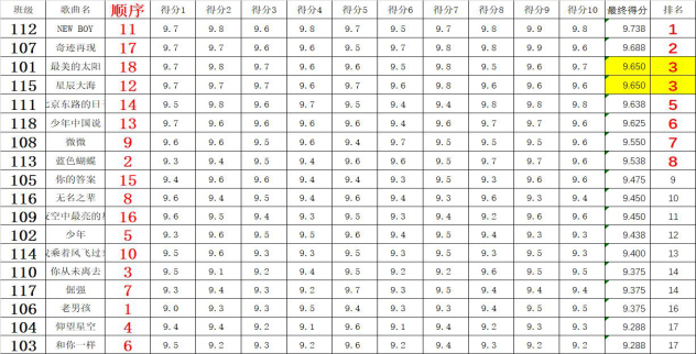 经过两个半小时的激烈比拼,高一年级合唱比赛各班成绩如下表: