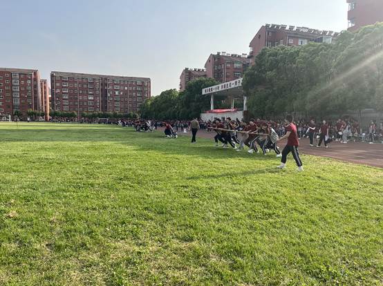 每年春季运动会不同于秋季运动会,它是一场团体娱乐活动,参与度极高,充分显示集体的智慧与力量。设置的项目有师生拔河、“8”字跳绳、大脚板、障碍接力、袋鼠跳、扶杆绕环等。