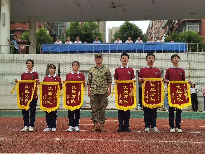 之后,副校长祝亮宣读了军训优秀学员和优胜方队表彰名单。获奖班级的学生代表依次上台领取奖状、锦旗,学校梅校长、付书记和李涛部长为他们颁奖并合影留念。