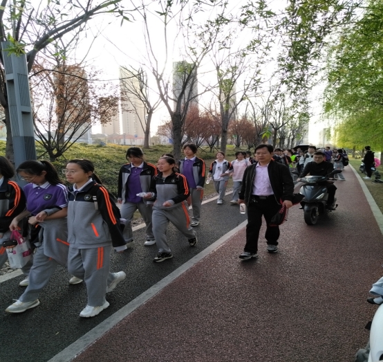队伍整齐有序的由学校西门出发,很快就来到风景优美的老澴河公园。草绿水清,繁花似锦,如画般的美景瞬间就驱散了全体师生的疲劳,给新的一天注入了全新的动力。