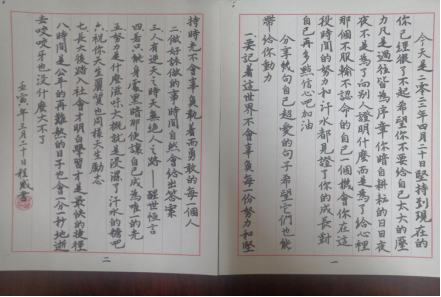 钢笔字比赛,中文统一安排为给高三学生的一封信,以为高三学生加油为主题,一律使用楷书或行书字体;英语统一要求为一篇短文,文章自选;其他科目不做统一要求,可以为一道题的解题过程,也可以为给高三学生的一封信。要求书写规范、清楚、流畅、美观。活动共收到58件作品,老师们书写或遒劲有力,或端正娟秀,满怀着对即将走入高考考场的高三学子的关爱与祝福。