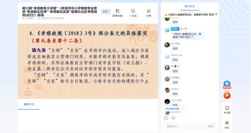 为进一步加强我市高素质、专业化、创新型教师队伍建设,充分发挥我市中小学教师梯级专业荣誉“孝感教坛名师”“孝感教坛名家”的示范引领作用,孝感市教育局制定了《孝感市中小学梯级专业荣誉“孝感教坛名师”“孝感教坛名家”管理办法及考核细则(试行)》,为了让更多教师学习了解此项《孝感市中小学梯级专业荣誉“孝感教坛名师”“孝感教坛名家”管理办法及考核细则(试行)》,于11月22日举办了2022年第七期孝感教育大讲堂。