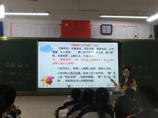 按照备课组教学教研计划,12日课间自习时间,杨玉艳老师在高三(19)班主讲了本次月考试题讲析公开课。高三本次月考使用“金太阳十月联考”试题。杨老师的公开课以试题中古代诗歌阅读部分为中心内容展开教学。预备铃响前,学生起立朗读,声音琅琅;教师巡视,督促指点。之后,老师在一体机屏幕上出示课前综合练习的批改图片。对不合要求的十位同学,以要求他们逐个背诵成语词义作为处理。接着,转入本节课教学主要内容。老师选取学生们失分严重的古代诗歌部分讲解。试题第15题考查对诗歌的理解和赏析,第16题考查诗歌艺术技巧的精妙及其在诗歌结构上的作用。讲解第15题时,老师引导学生复习诗歌语言无序性特点等知识,指出C项错在没有准确理解诗句倒装而弄错动作行为的主体和对象。讲解第16题时,老师从试题题干中分析答题的思路,指出解答“精妙”“结构上的作用”这类题目的步骤、方法和规范。讲解中,老师分析讲解,带着学生复习旧知,联系拓展;学生积极思考,主动作答,互动交流。