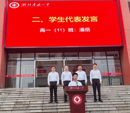 第二项,高一(11)班的潘岳同学作为新生代表上台发言。他代表全体新生庄严承诺:在接下来的军训中,必将以军人的标准严格要求自己,一切行动听指挥,自觉接受一次人生历练;必将发扬不怕苦、不怕累的精神,磨砺意志,锤炼品格,以饱满的热情和昂扬的斗志投入训练,圆满完成各项任务,为高中生活写下浓墨重彩的第一笔。