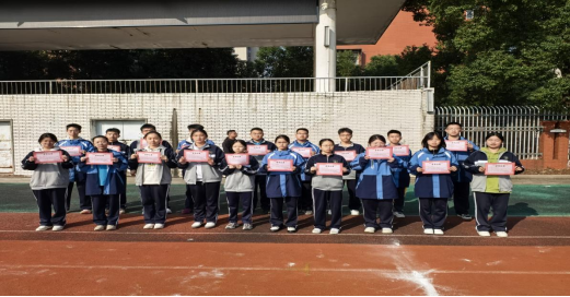 年级负责人钟华志为获奖学生颁发荣誉证书,为优胜班级授予流动红旗。阳光下,获奖学生及班级代表的笑容与飘扬的流动红旗相映,成为校园里一道昂扬的风景线。此次表彰依托课间跑操这一集体活动开展,既节省了教学时间,更强化了全体学生的集体荣誉感与争先意识。