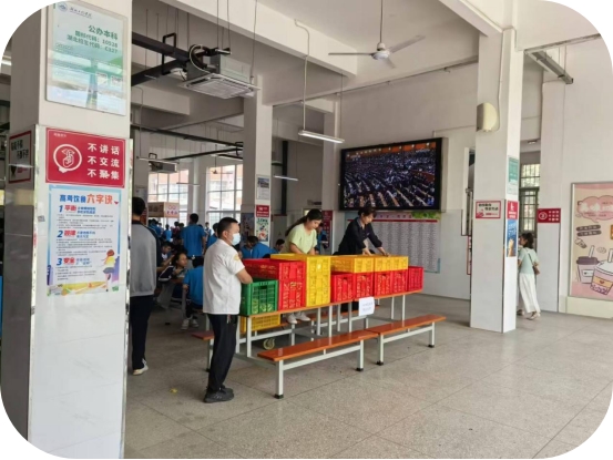 食堂工作人员为学生发放免费水果